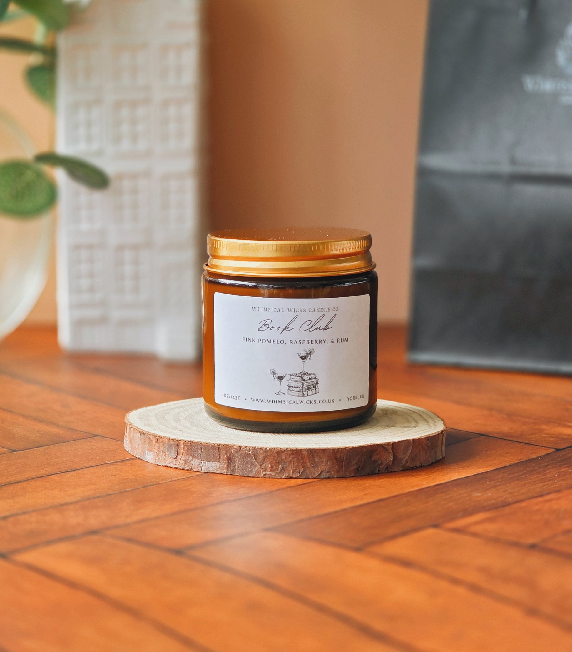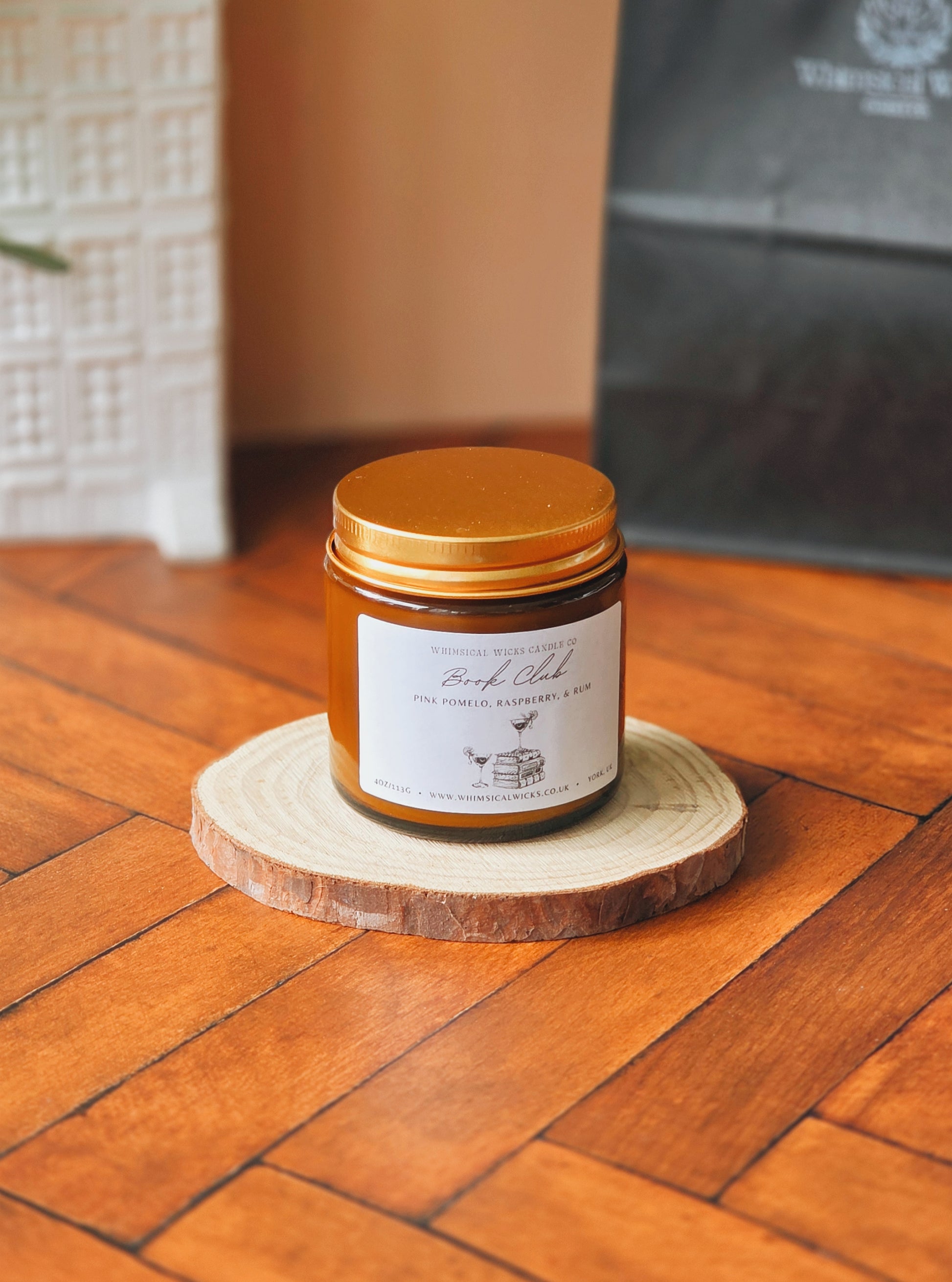 A vegan soy wax candle featuring a fruity blend of pink pomelo, raspberry, and rum.