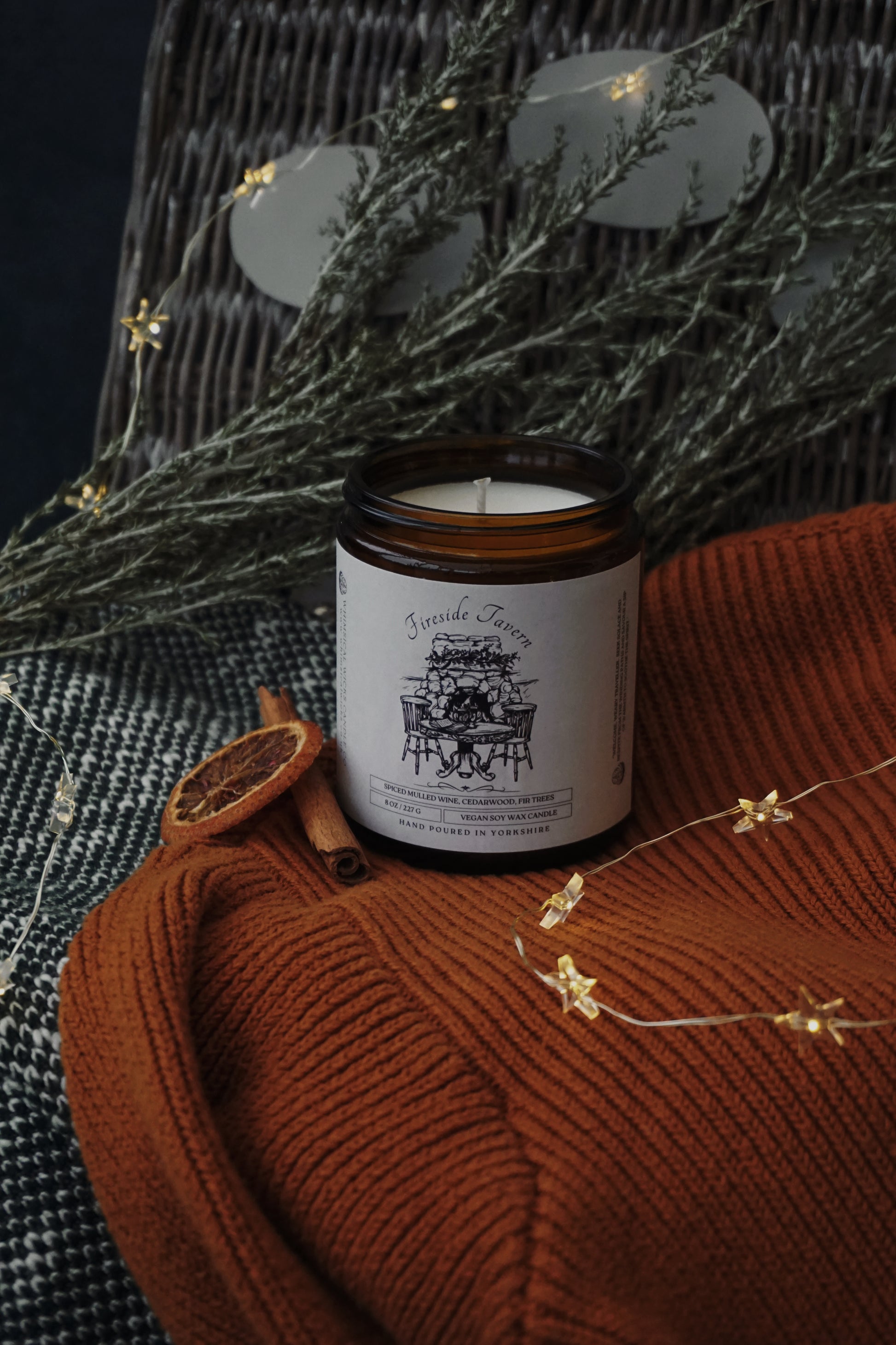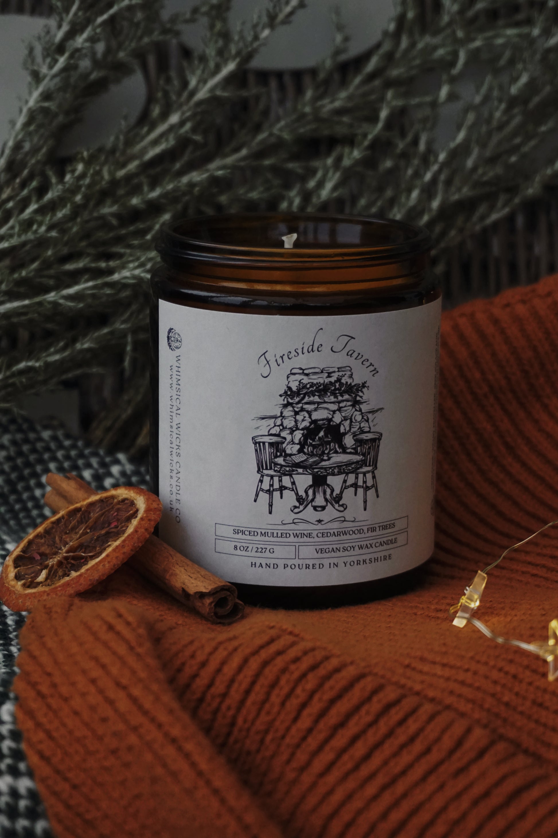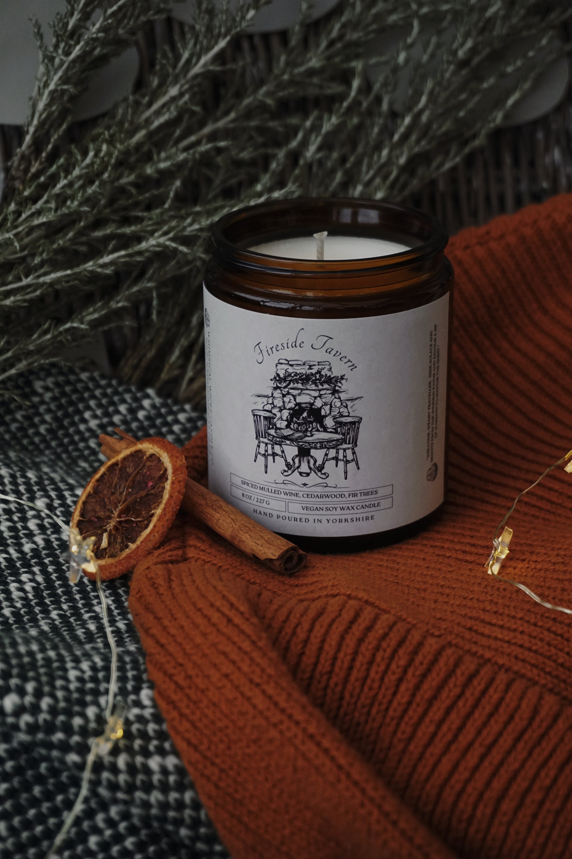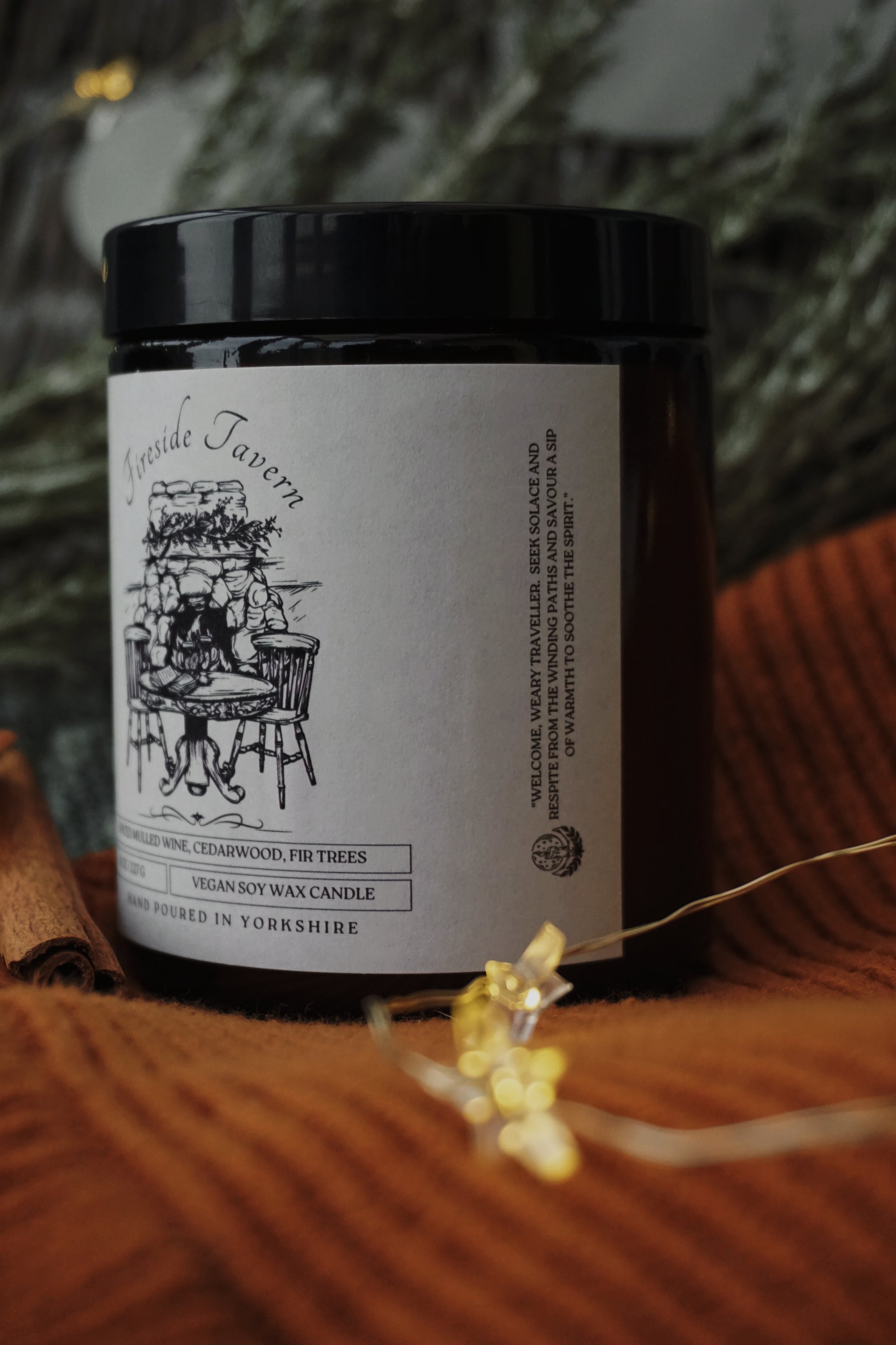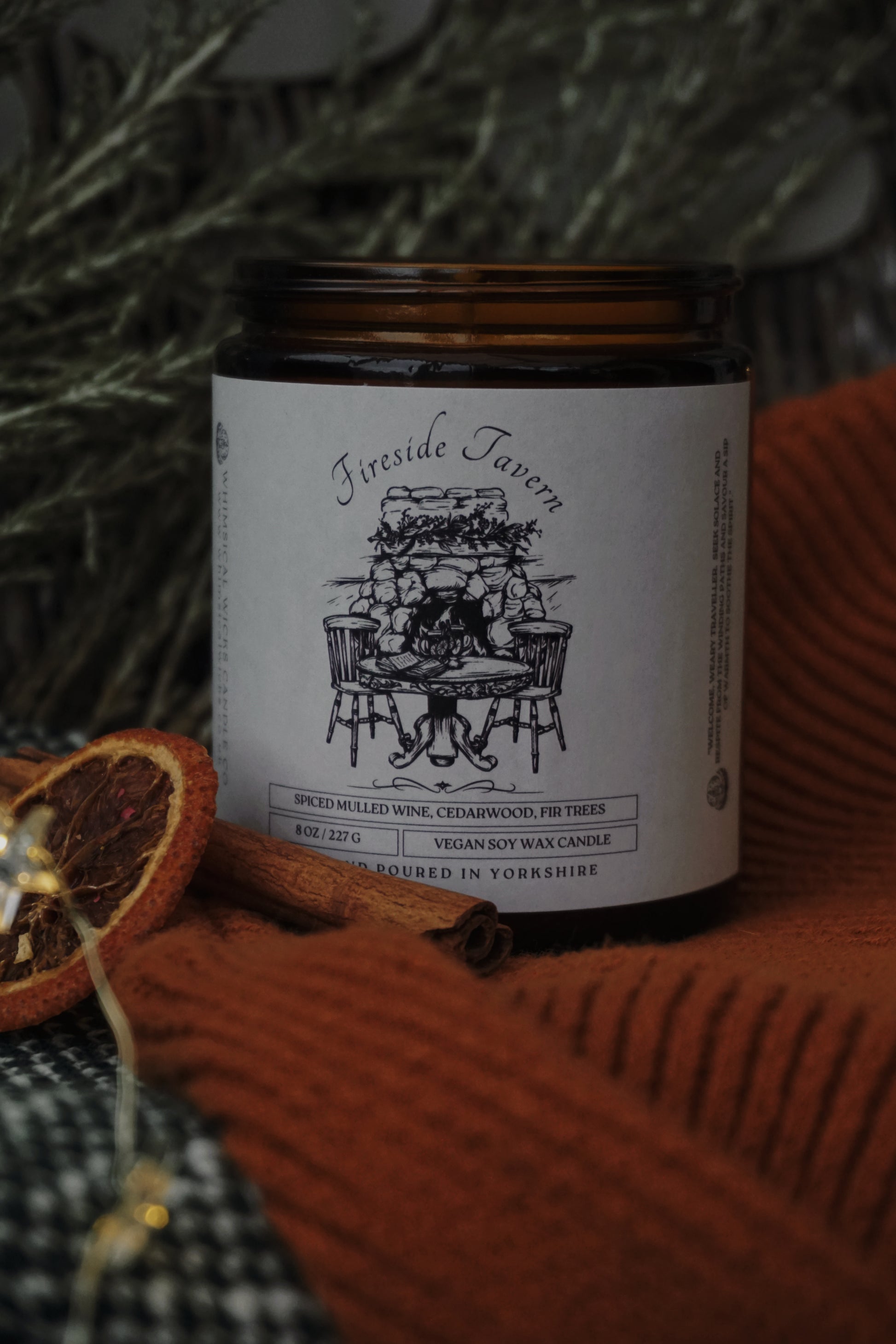 An 8 ounce vegan soy wax candle featuring a warming blend of spiced mulled wine, cedarwood, and fir trees.