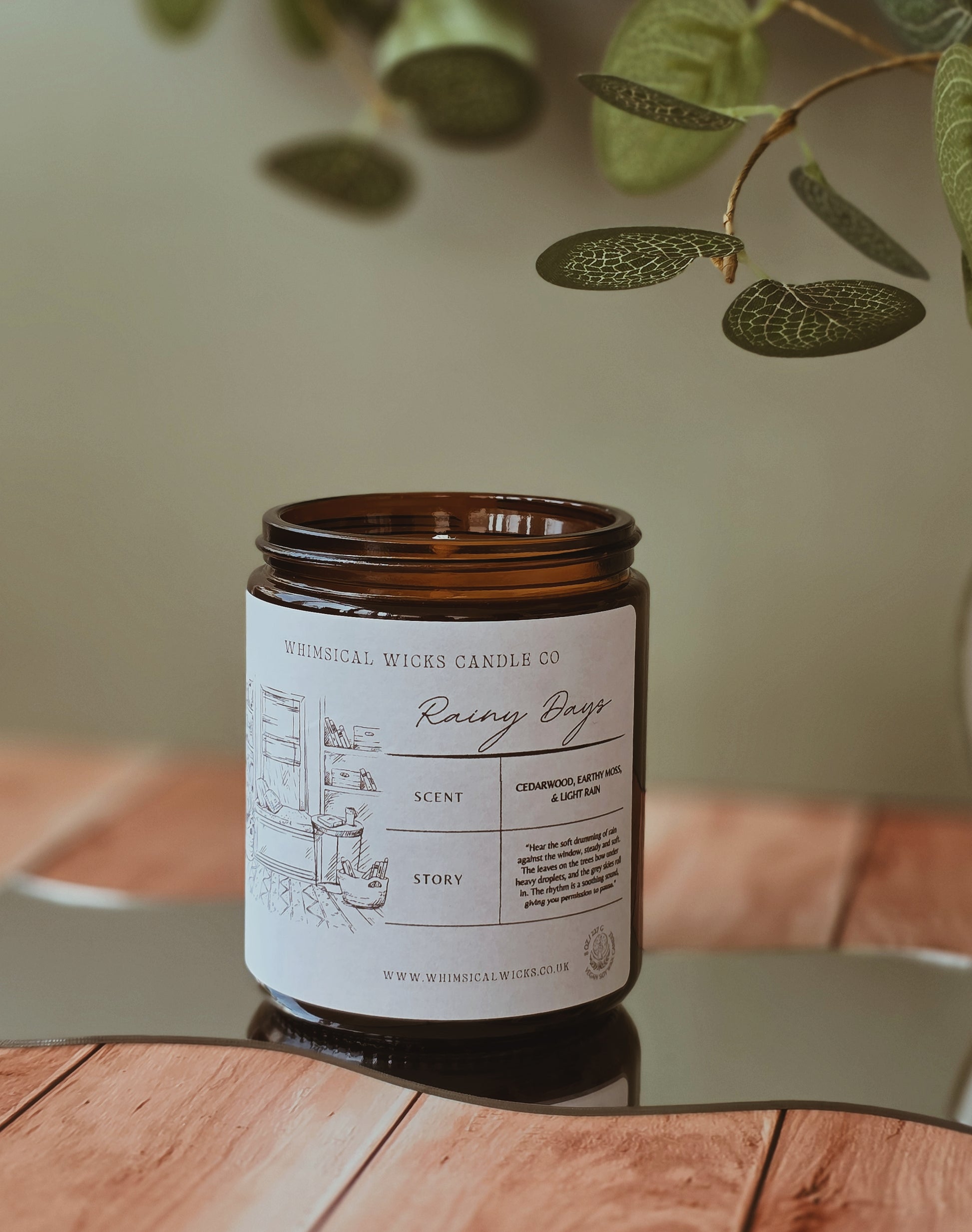 An 8 ounce vegan soy wax candle featuring a cozy blend of cedarwood, earthy moss, & light rain.