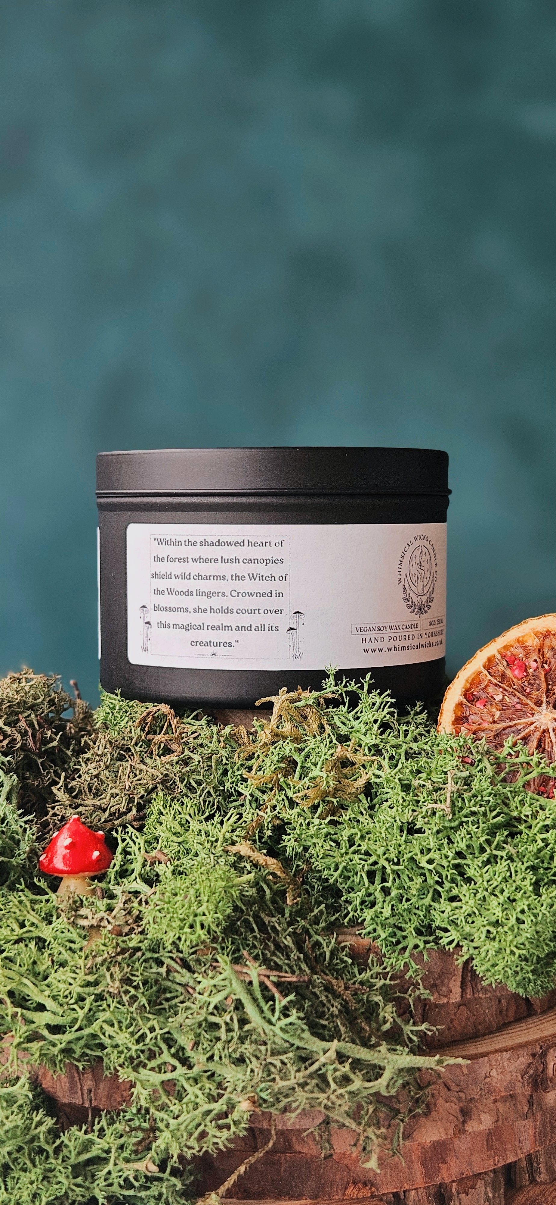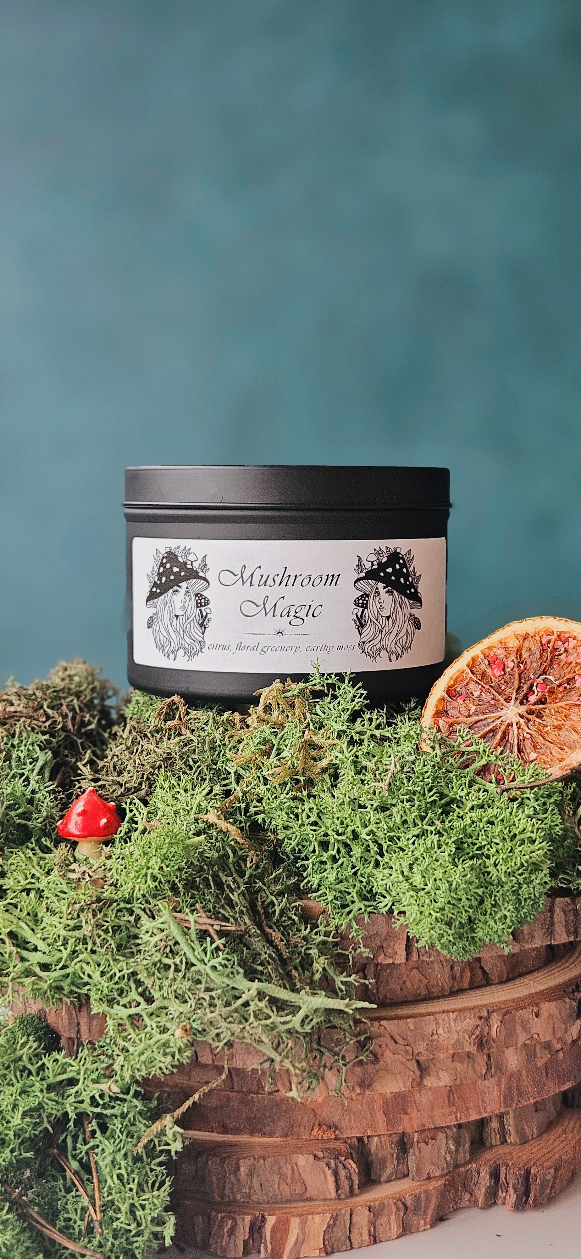 An 8 ounce vegan soy wax candle featuring an earthy blend of citrus, floral greenery, and moss.