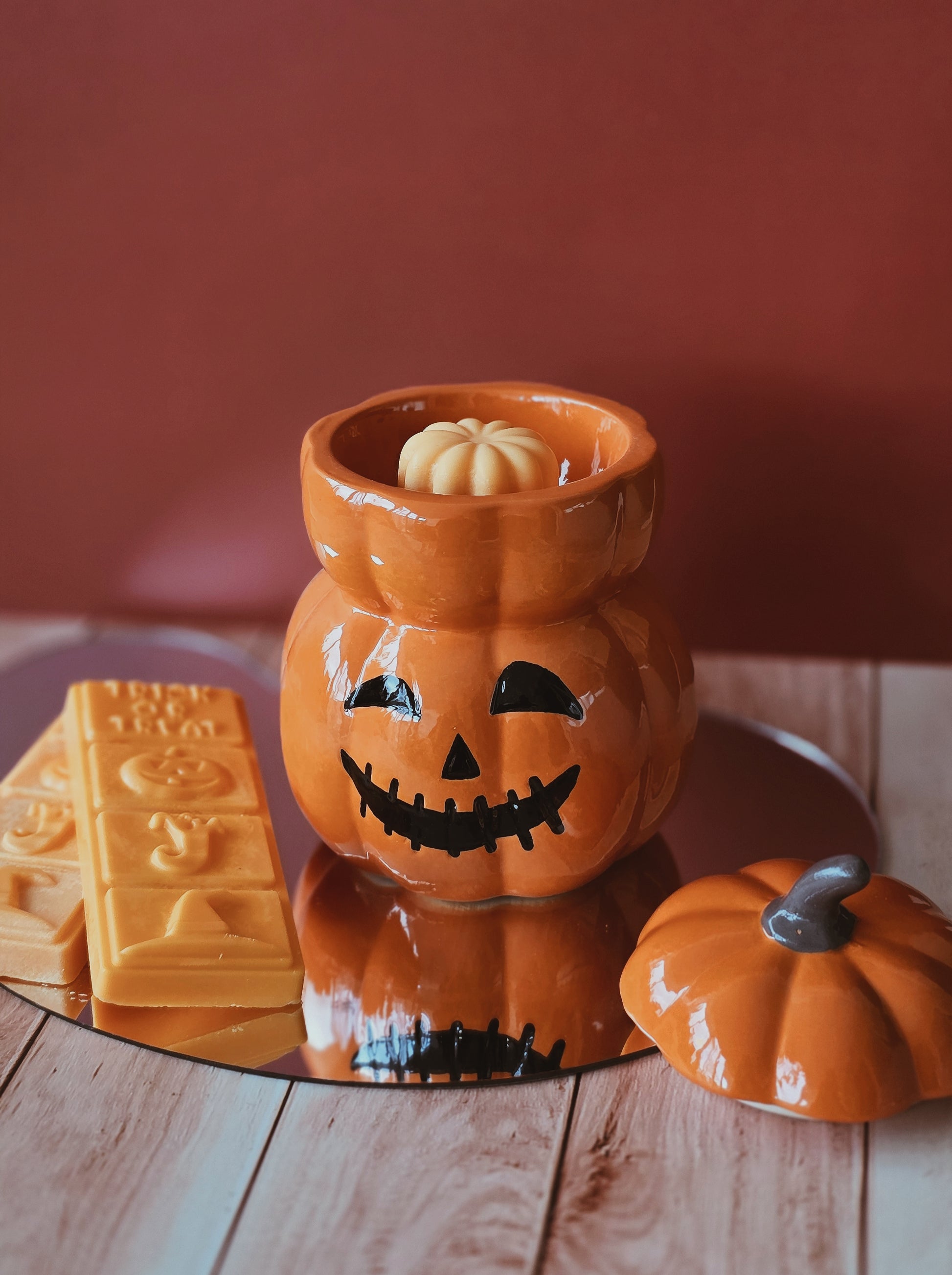 Celebrate Halloween with this charming stacked pumpkin wax warmer, ideal for releasing seasonal fragrances into the home whilst illuminating the spooky jack-o'-lantern face with a candlelit glow.